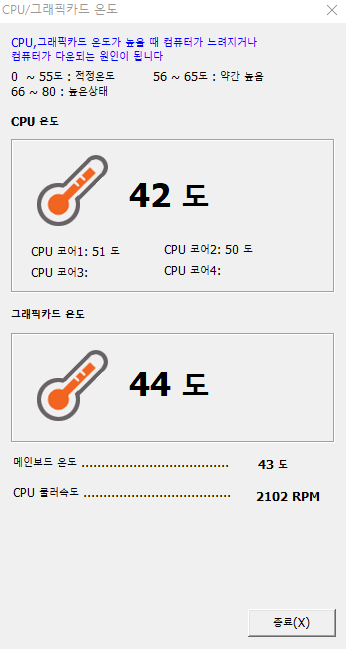 -CPU와 그래픽카드의 온도 및 시간: PC에 장착된 CPU, 그래픽카드, 메인보드 등의 온도와 가동 시간 등을 모니터링할 수 있습니다.