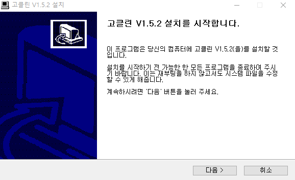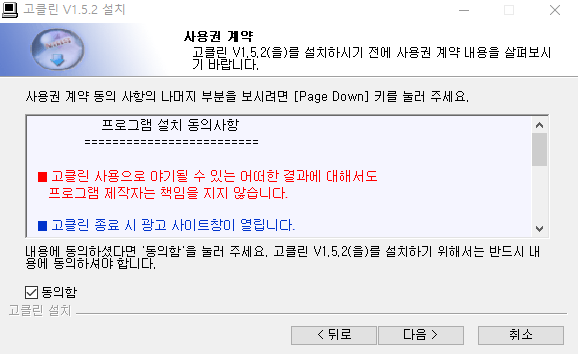 고클린 V1.5.2를 받으시 후 gocleansetup152.exe를 두번 연속으로 클릭하시면 아래와 같은 창이 뜹니다. 그럼 하단의 다음을 선택하면 동의를 선택하시고 다음으로 진행하시면 됩니다. 다음이 나올 때마다 선택하시면 이렇게 설치 완료가 뜹니다.