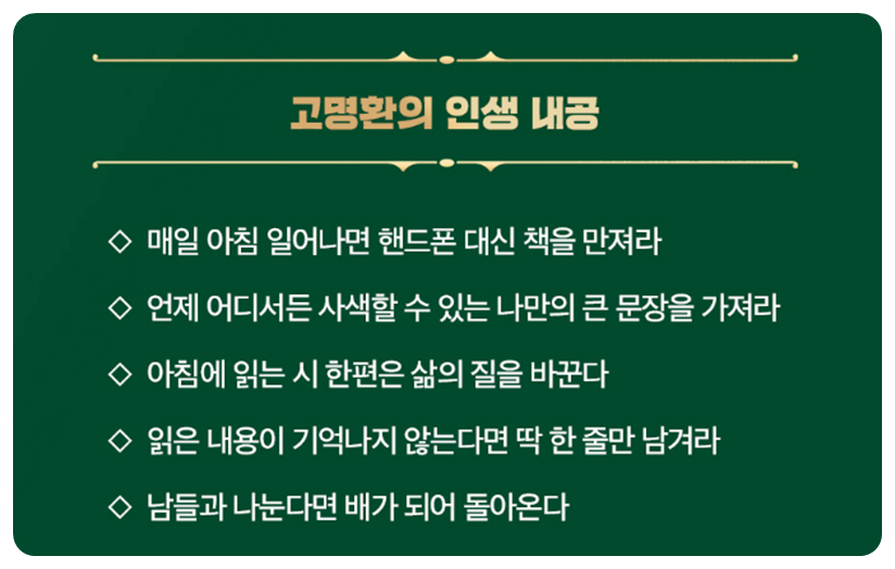 대기업 CEO가 단독 오찬에 초대하고, 전국의 소상공인들이 가게로 찾아오고, 하루에도 수십 통씩 DM을 받는 고명환에게 사람들이 공통적으로 궁금해하는 것이 있습니다. 바로 “그래서 당신은 어떻게 책에서 해답을 찾았는가?”입니다.
