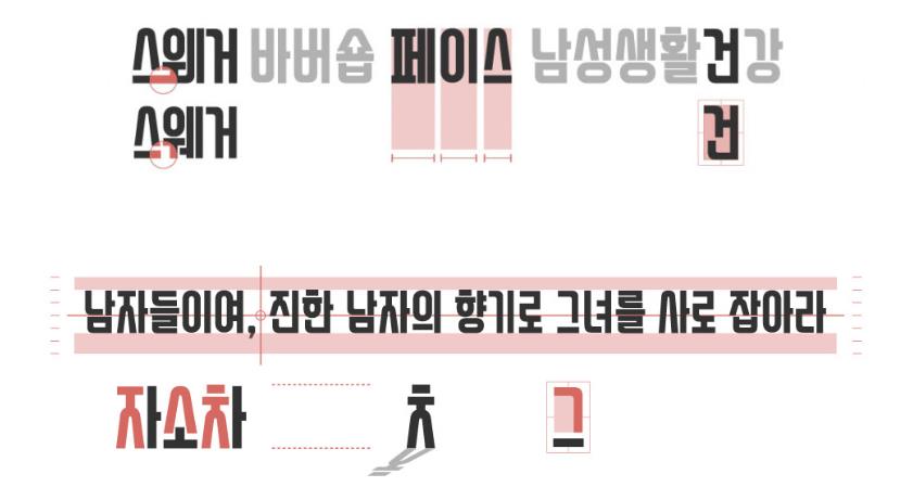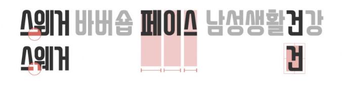 스웨거가 추구하는 남자의 이미지가 폰트에 그대로 반영되어 ㅅ. ㅈ. ㅊ 계열들이 사람이 서 있는 것처럼 당당한 모습으로 형상화되었으며, 초성을 조금 크게 하여 전체적으로 흔들림 없이 꽉 짜인 든든한 구조도 스웨거체의 두드러지는 특징입니다.