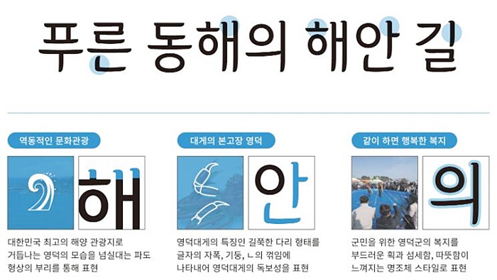 영덕해파랑체는 영덕 대게의 외형적 특징과 상징성을 스텐실 기법으로 표현한 서체로 한글 2,780자, 라틴 95자, KS심볼 985자로 구성되었습니다.