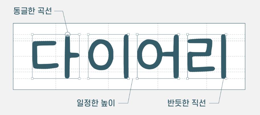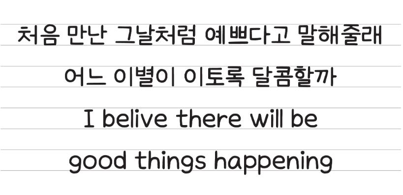 하이멜로디는 비사각형 구조의 시각적 리듬과 아기자기한 손글씨를 강조한 한글과 라틴어 폰트입니다.