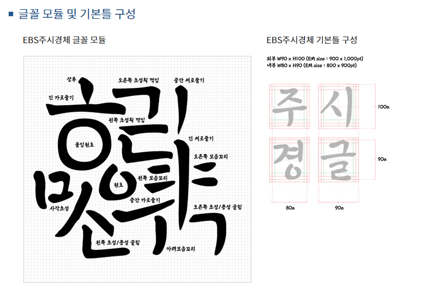 EBS주시경체는 콘텐츠저작권강화와 다양성을 확보하기 위해 개발되었습니다. 한글학회로부터 주시경선생의 '국어문법'육필본 원본자료를 협조받아, 자체적으로 글꼴원형의 특성을 분석, 디지털화를 위한 글꼴을 기본모듈을 착안하여 3가지의 굵기로 파생하였습니다.