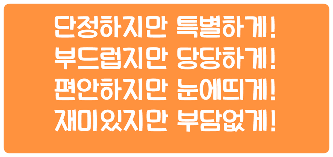 트렌디한 네모꼴폰트에 라운드를 적용해 위트를 더했습니다.