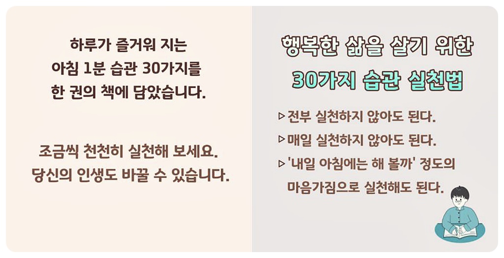 이 책에서 소개하는 30가지의 습관은 반드시 매일 아침에 해야 하는 것은 아닙니다. 페이지를 넘겨보며 ‘내일 아침에는 의식해서 이걸 해보자’라는 정도로 실천해도 괜찮습니다. 자연스럽게 습관이 되면 일의 생산성이 높아지고, 쓸데없이 낭비하는 시간이 줄어 좀 더 여유가 생긴다는 것을 체감할 수 있을 것입니다.