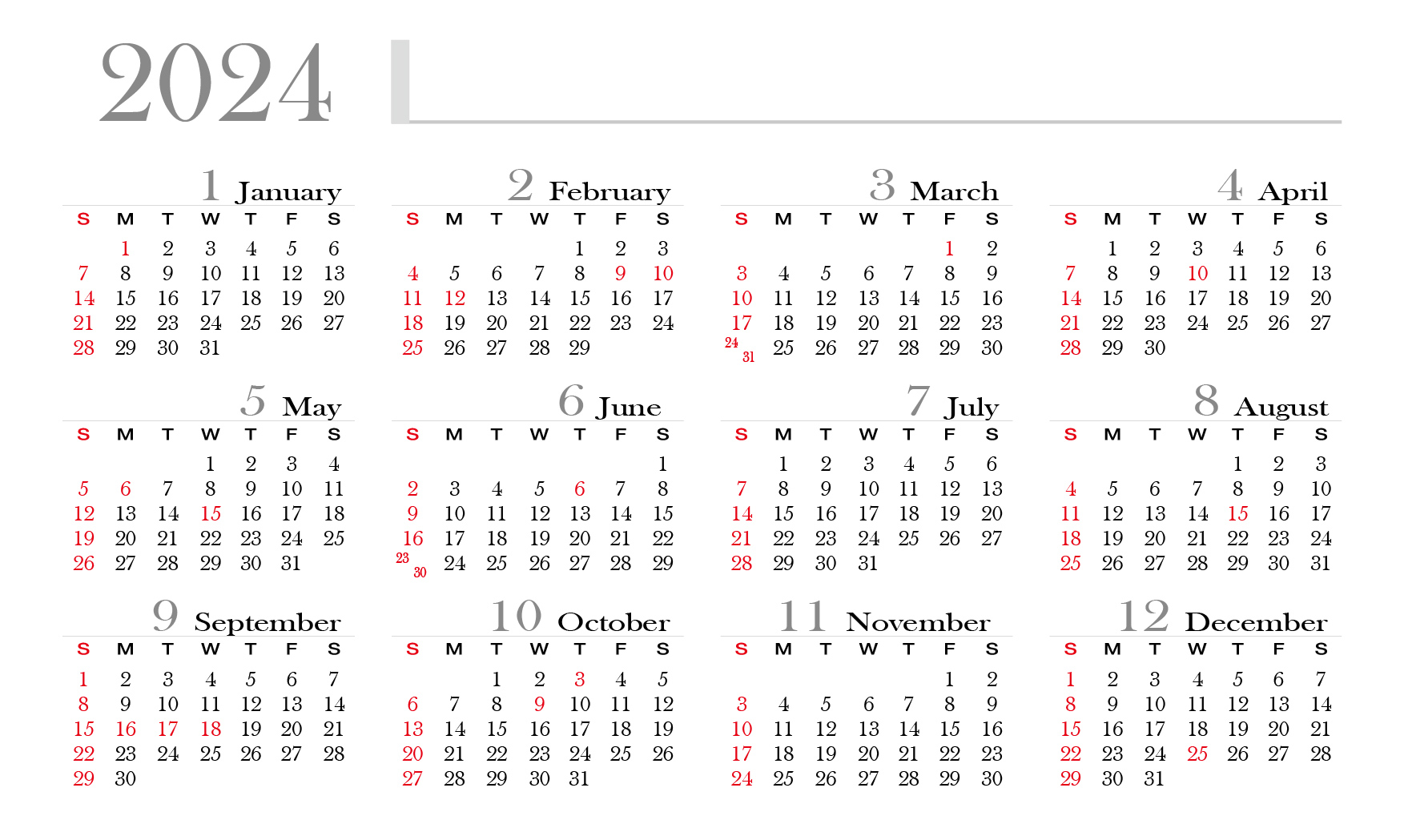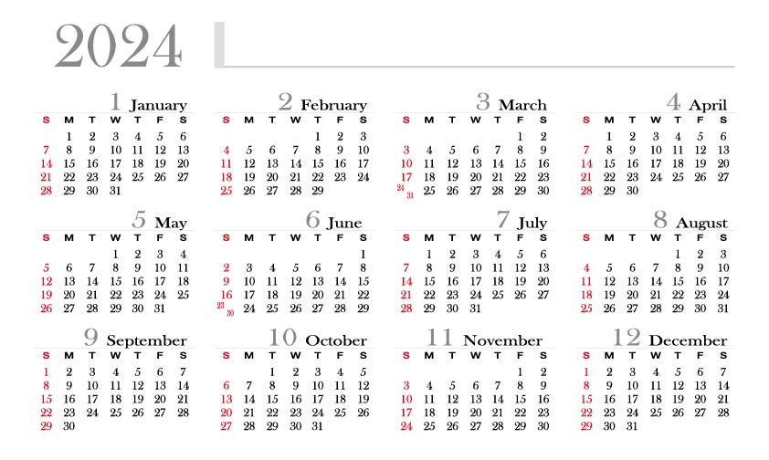2024년 달력 ai파일(한국 공휴일 제외)